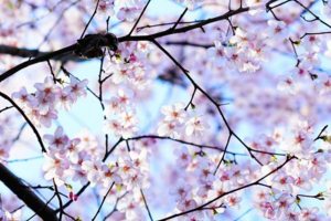 綠水青山間,夾雜著一叢叢白色、淡粉色的櫻花晴時明媚,