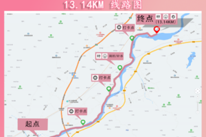 全程13.14公里,代表了“一生一世”的寓意,迎賓廣場起點(主會場)→穿過迎賓大道進入1314綠道→經過大夫楊帆、大澤鳶飛等江邊景觀→至龍泉頭村終點,全程都是平坦的沿江綠道,風景怡人,十分舒適,關門時間4.5小時。