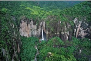 三折瀑系一條水流,歷掛三處危崖,形成上、中、下三條姿態(tài)各異的瀑布。下折瀑揚(yáng)揚(yáng)灑灑,中折瀑凌空飄落,猶如一粒粒珍珠紛飄落潭中,絢麗多姿,被譽(yù)為“雁山第一勝景”。而上折瀑則深藏群山之中,雖然形似中折瀑,卻更多了一份幽奧、粗狂、原始的神韻。