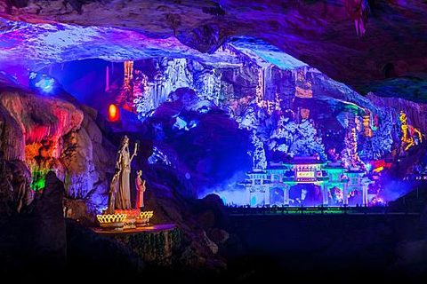 瑤琳仙境共分七個洞廳。進洞,穿過熒光長廊,即進入了前廳。前廳不大,但秀麗溫婉,頗似江南水鄉。經過“獅象迎賓”,即進入了“仙女聚會”的第一洞廳。眼前是一座燦爛的“宮殿”,30米高的穹頂上氣象萬千,五彩繽紛的鐘乳石猶如繁星閃爍,又似彩云飄浮。第二洞廳,地形跌宕起伏,峽谷幽深,清泉緩緩流過。有巨形石柱,“力拔山兮氣蓋世” ,人稱 “擎天玉柱”。在第三洞廳空曠無比,石筍漫天,層層疊疊。