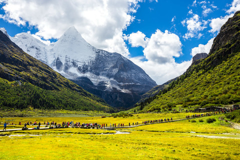 午餐后可自費乘坐電瓶車(建議乘坐電瓶車節(jié)省體力)前往【洛絨牛場】(如徒步需單程1-2小時左右達到洛絨牛場)。這里是觀【夏諾多吉神山】(意為金剛手菩薩,海拔5958米)【央邁勇神山】(意為金文殊菩薩,海拔5958米)的最佳地點,是稻城亞丁核心景區(qū)最具代表性的景點,一望無垠的草甸,一條如飄帶般柔美的河流在上面隨意的奔騰著,神山圣水與心共鳴,盡情沉醉在這夢幻之地吧。