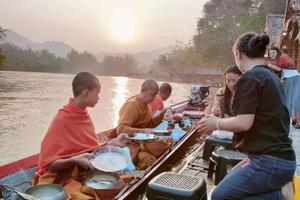 ? ? ? 清晨,感受萌峰一大亮點,老撾全國唯一一個可以在【水上布施】的,乘船游覽,觀萌峰水上風光。