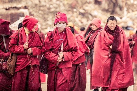 (4)在色達(dá)喇榮五明佛學(xué)院經(jīng)堂走動(dòng)時(shí),注意不要踩跨經(jīng)書,書包,經(jīng)架,以及出家人的披單,法裙等。不要用手隨意觸摸經(jīng)堂內(nèi)陳列的各種法器,唐卡。在佛學(xué)院與人打招呼,可以雙手合十,說“扎西德勒或者阿彌陀佛”。