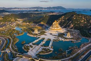 南海觀音坐落于雙峰山南端的觀音跳山崗上。此處勢隨峰起,秀林蔥郁,氣順脈暢,碧波蕩漾。蓮花洋彼岸的朱家尖,隔海侍衛(wèi);雙峰山坡麓的紫竹林,潮音頻傳。立像臺座三層,總高33米,其中佛像18米,蓮臺2米,臺基13米,臺基面積為5500平方米。佛像采用新型仿金銅精鑄。