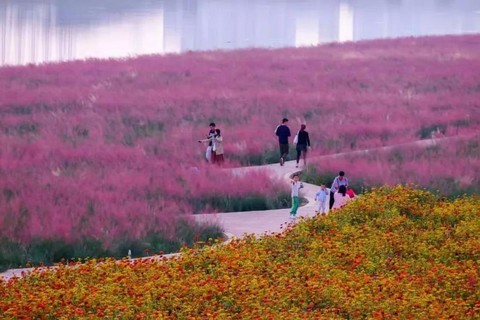 粉黛亂子草軟綿如霧,花穗如發絲,遠遠望去,像一片粉色棉花糖隨風搖曳。一眼望不到頭的粉色花海,伴著微風,隨風搖曳,呈現出粉色云霧狀夢幻效果,見之讓人心情舒暢。