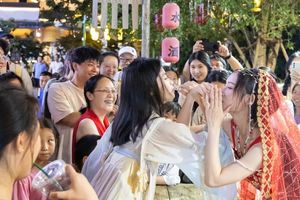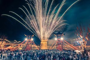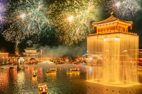 儺舞廣場每天晚上都會上演抱玉塔建筑燈光秀《天工開物》,用光影將古老的故事娓娓道來,五顯湖中,金閣騰空而出,水幕光影流光溢彩,為夜色增添更多的夢幻。