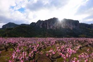 春來后岸,萬樹夭桃布畫廊,薰風濃染古山莊,溪盈春浪紅翻岸,樓沐晴霞艷過墻,鐵甲威龍曉霧收,千紅萬紫總回眸。一派大地春歸,桃花盛開的爛漫風情。