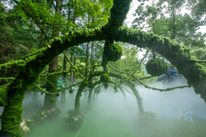 苔蘚如綠絨云團裹住蒼勁樹干;