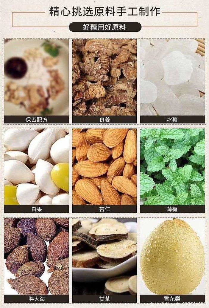 ? ? ? 梨膏糖是純白砂糖(不含飴糖、香精、色素)與杏仁、川貝、半夏、茯苓等十四種國產良藥材(碾粉)熬制而成。口感甜如蜜、松而酥、不膩不粘、芳香適口、塊型整齊、包裝美觀,由于品質優良,療效顯著,在國內外享有盛名,深受廣大男女老少的喜愛。而一般糖果:是有白砂糖、飴糖、香精、色素等熬制而成。